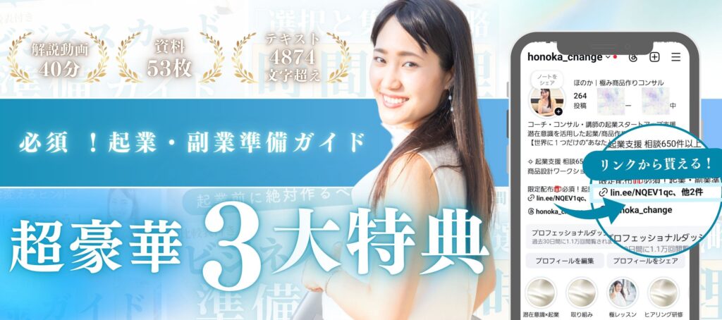 ■プロフィール 起業コンサルタント|ほのか 娘が0歳の時に10年続けた歯科衛生士を手放し、職場を退職。 知識もスキルもゼロから起業。 時間と場所に縛られない働き方を実現し、 開業届提出後半年で月商100万円達成。 業界トップコンサルタントの仙道達也先生の元で 個人起業の商品作りについて学びを続ける。 現在は、起業初期のコーチ・コンサル・講師を中心に、 「使命に合った”極み商品づくり”」と「長続きする起業設計」をサポート中。